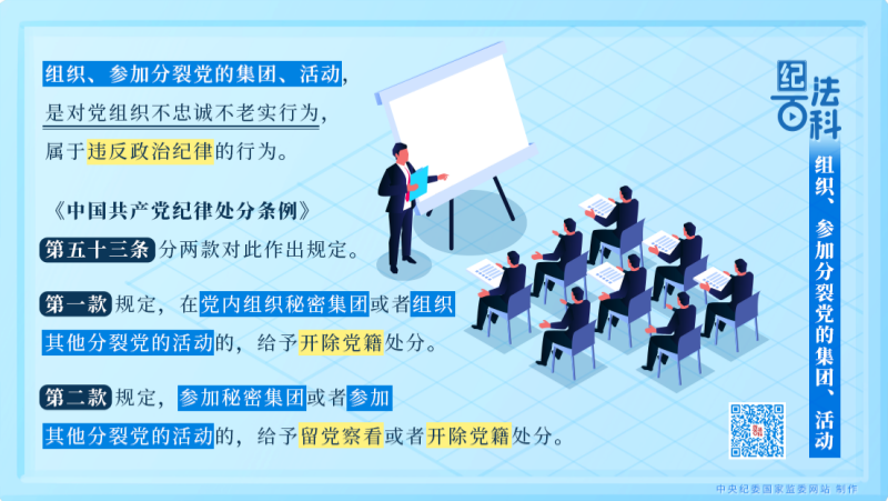 《中國共產(chǎn)黨紀(jì)律處分條例》第五十三條分兩款對(duì)此作出規(guī)定。第一款規(guī)定,在黨內(nèi)組織秘密集團(tuán)或者組織其他分裂黨的活動(dòng)的,給予開除黨籍處分。第二款規(guī)定,參加秘密集團(tuán)或者參加其他分裂黨的活動(dòng)的,給予留黨察看或者開除黨籍處分。